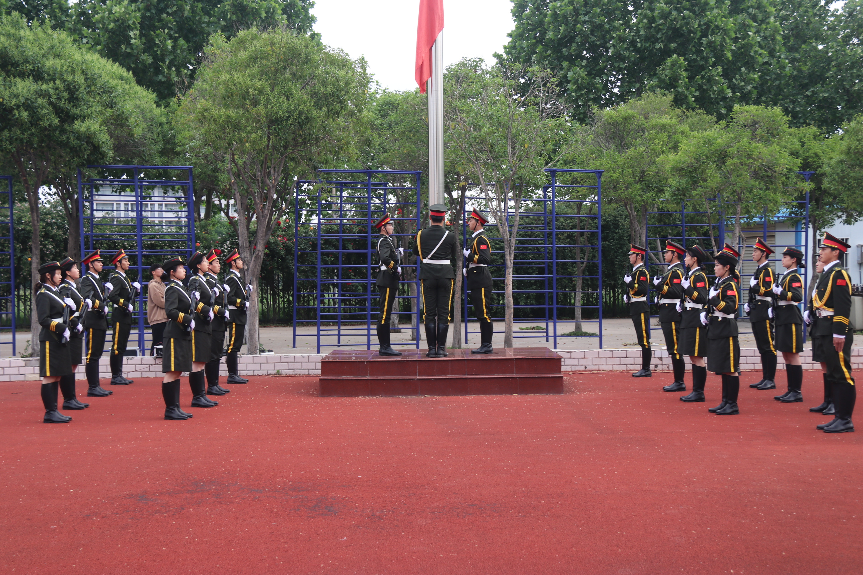 仪式开始,国旗护卫队队员们身着整齐的队服,踏着铿锵有力的步伐护送国旗入场。在初升的朝阳下,在全体人员的注目中,伴随着激昂雄壮的《义勇军进行曲》,鲜艳的五星红旗冉冉升起。