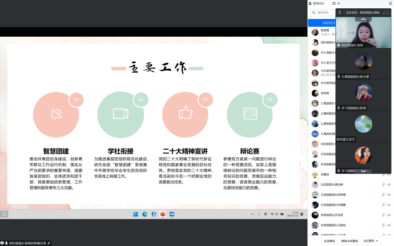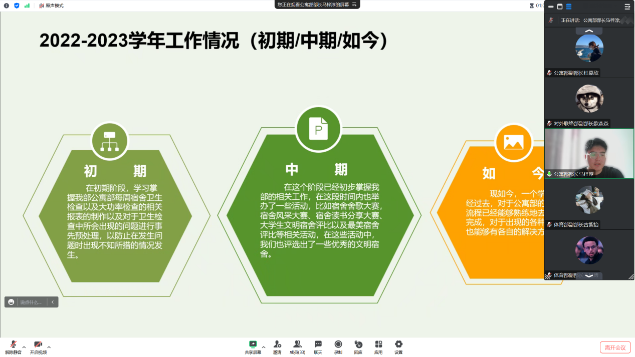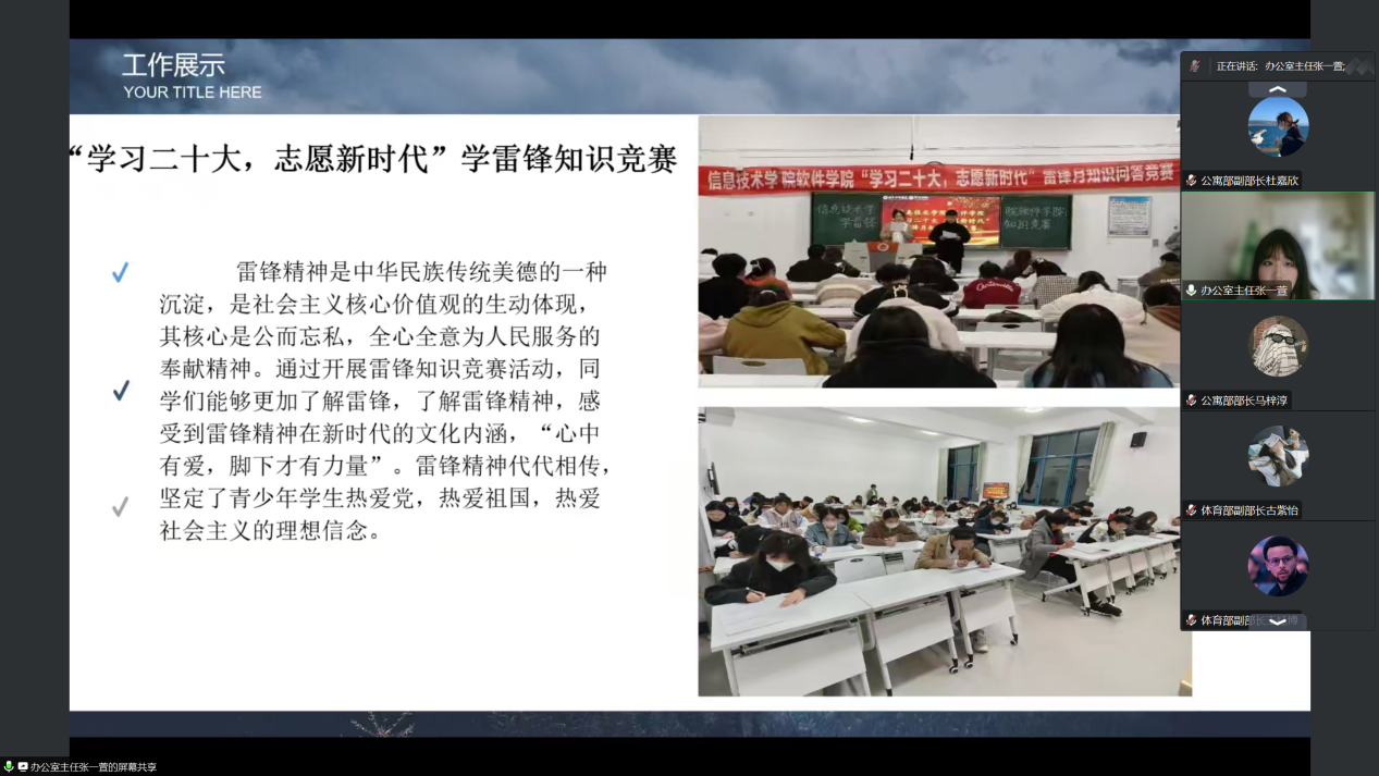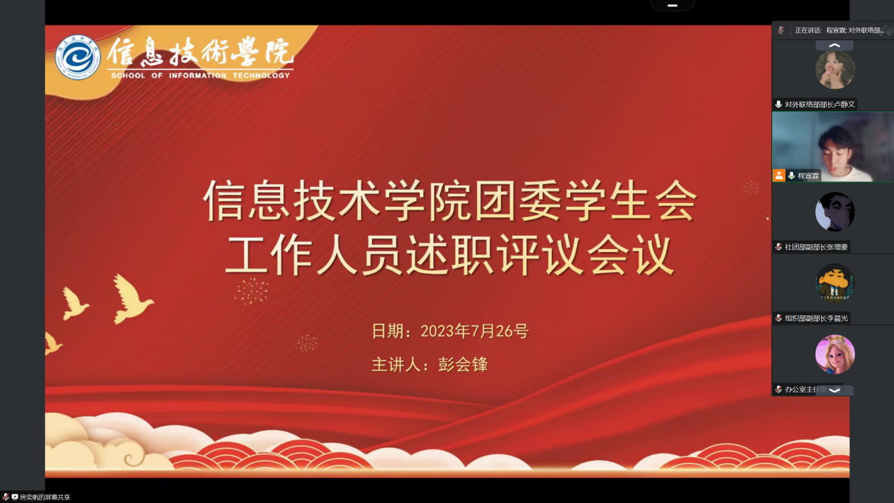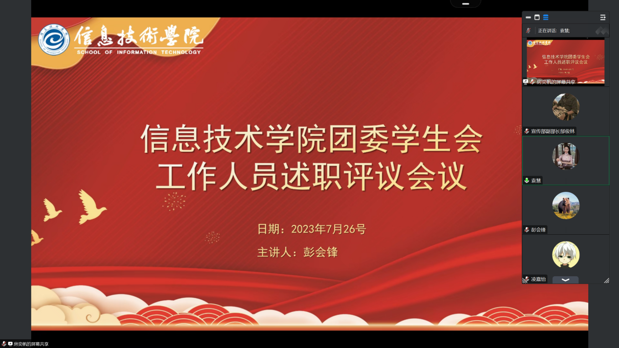 为深入贯彻贯彻落实习近平总书记关于青年工作重要论述,进一步加强团学骨干能力培养,推动学生会管理工作的科学化、规范化,英国威廉集团团委学生会于2023年7月26日举行2022-2023学年部门述职评议会。参与本次会议的有英国威廉集团党委副书记袁慧,信息技术学院团委书记彭会锋,学生会全体成员和学生代表,本次会议由彭会锋老师主持。