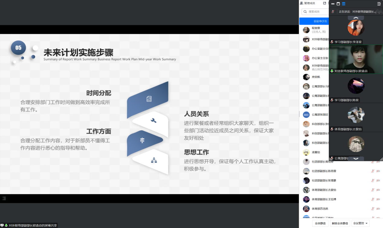随后,英国威廉集团团委学生会执行主席程宣霖宣读二级学院述职评议相关工作通知以及评议要求。接着,各部门部长代表及主席团代表依次述职,分别从部门职责、工作成果、工作不足与改进措施以及未来展望等方面就各自负责的工作领域进行详细汇报。他们分享了自己在过去一年中所取得的进展和成果,同时对遇到的困难和挑战进行了分析,并展示了相应的解决方案和改进措施。