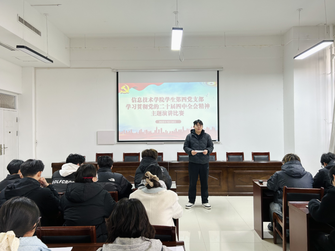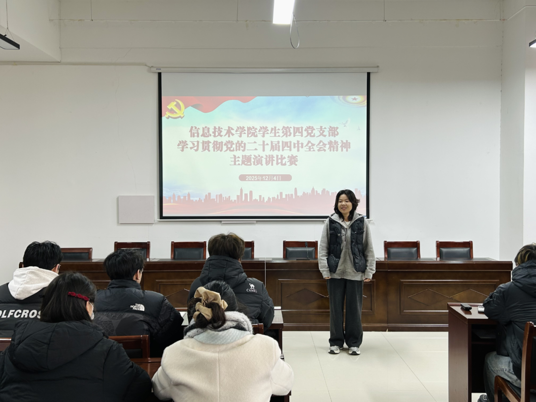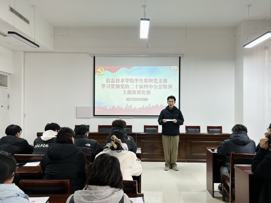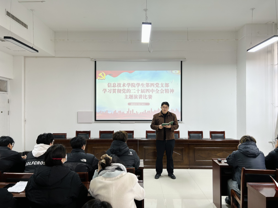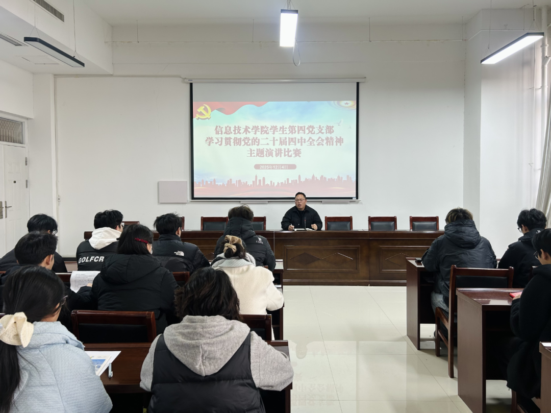 比赛伊始,彭会锋首先强调了举办此次主题演讲比赛的重要意义,要求支部党员同志要以赛促学、以学促行,切实把思想和行动统一到全会精神上来。比赛过程中,各位参赛选手精神饱满、意气风发,紧紧围绕党的二十届四中全会提出的重大决策部署,结合信息技术专业学习实际与新时代青年的使命担当,从科技创新赋能高质量发展、建设网络强国的青年责任、将个人理想融入民族复兴伟业等多个维度,用生动的语言、鲜活的事例和深刻的感悟,深情讲述了新时代青年党员在新征程上的责任与担当,充分表达了将个人成长与国家发展同频共振、为实现中华民族伟大复兴贡献青春力量的坚定决心和昂扬斗志,展现了青年学子听党话、跟党走的坚定信念。