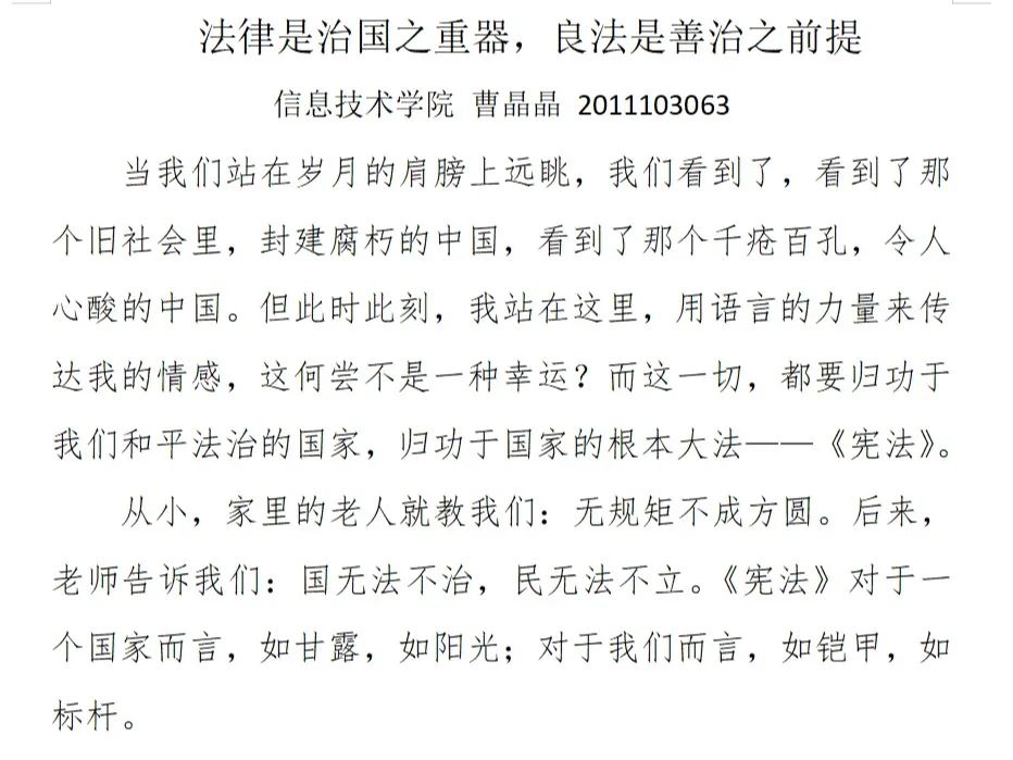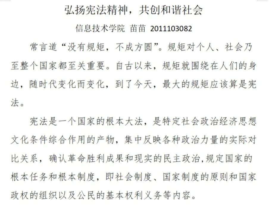 法律面前人人平等,依法治国人人有责。此次活动的顺利举办,让学生意识到了学习宪法的重要性,也督促其将宪法精神更好的融入今后的学习生活中去,争做学法、知法、守法,全面发展的新时代大学生。