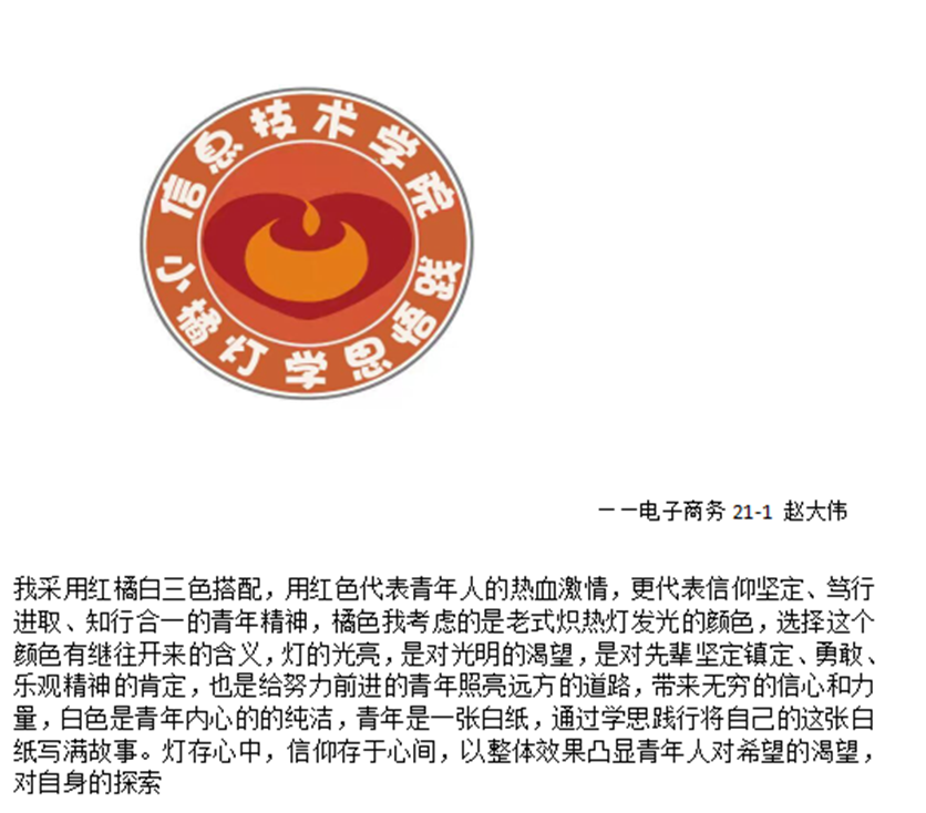 本次活动以打造青年力量品牌为主题,采用线上征集的形式,面向各年级学生征集原创logo。参赛同学们大胆创新,肆意挥洒着自己的创意与才华,不仅创作出独一无二的、具有鲜明特色的“小橘灯”logo,而且详细地阐述了自己的设计立意。经过两轮激烈的角逐,最终由评选委员会评选出了我院“小橘灯”育人工程的专用logo。