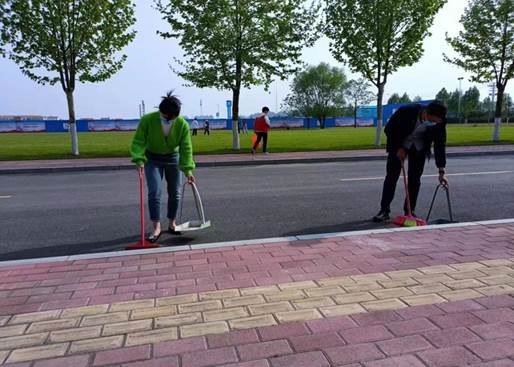 老师们与青年志愿者们分工合作, 共创整洁校园。