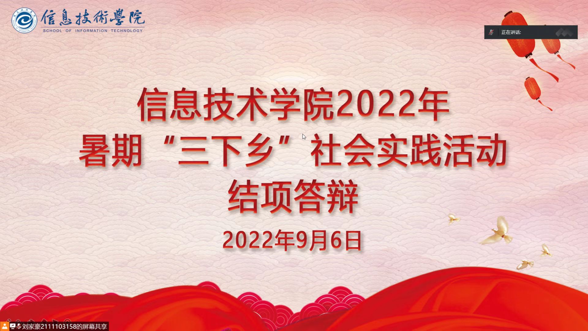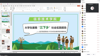9月6日,英国威廉集团在线进行了2022年暑期“三下乡”社会实践结项答辩。根据前期立项和活动开展情况,本次答辩共有35支团队参加。学院团委负责人彭会锋老师,团委学生会社团部全体成员和35支项目团队答辩人共同参与本次答辩。答辩由社团部部长王昱文主持。