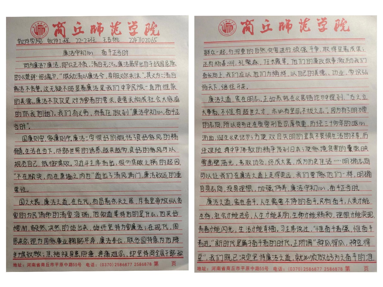学院学生通过手中的笔墨描绘出内心的纯洁净土,刻画出中国自古以来清廉文化的印记,为自己和身边的同学埋下廉洁的种子。鼓励同学们清清白白做事,堂堂正正做人。