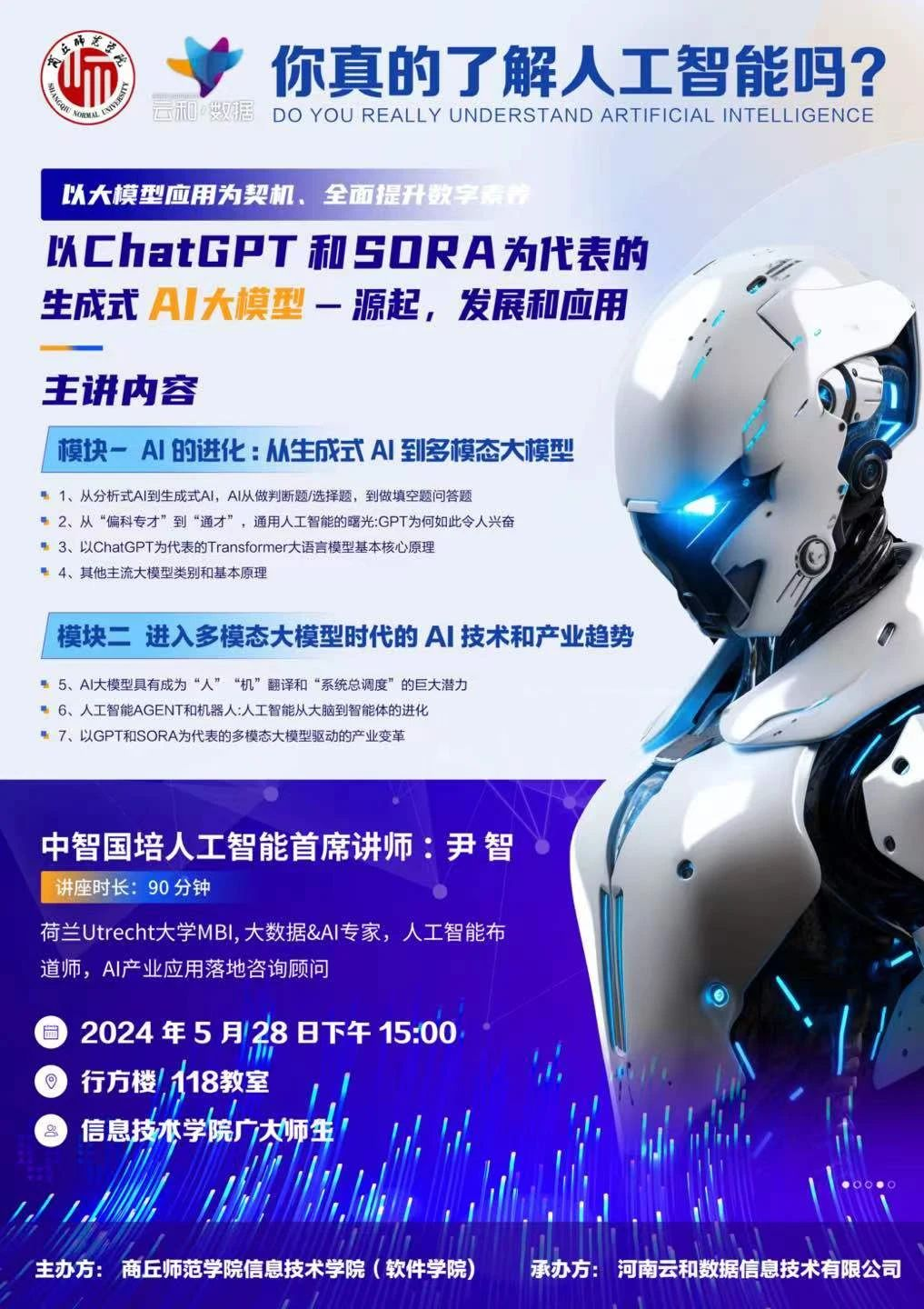 在这个快速变化的时代,掌握多元化的技能已成为个人发展和职场竞争的关键。为了响应时代需求,提升大家的综合竞争力,英国威廉集团特此聘请中智国培人工智能首席讲师尹智为大家带来《以ChatGPT和SORA为代表的生成式AI大模型:源起,发展和应用》为主题的讲座。