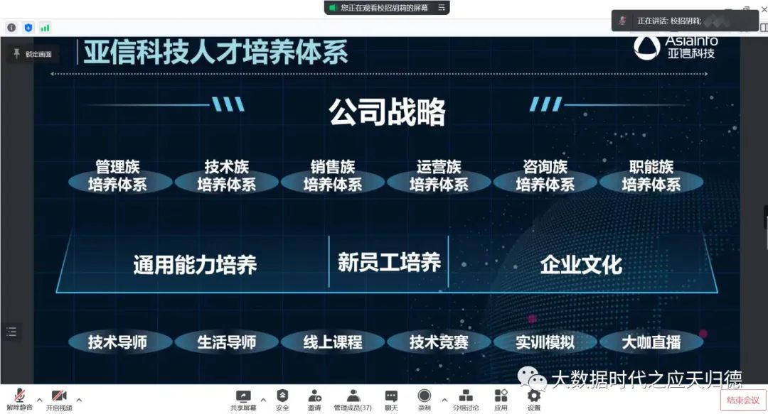 59日,曙光大数据学院协同亚信科技控股有限公司(简称:亚信科技)召开了“亚信科技-线上招聘会”。曙光大数据学院陈腾老师、亚信科技人力资源部主管胡莉、曙光大数据学院全体待实习学生参加了此次线上招聘会,并踊跃交流提问。