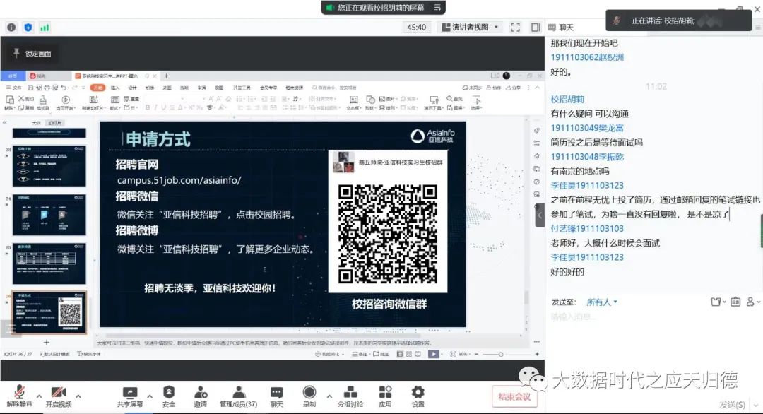 通过本次专场招聘会,相信各位同学对亚信科技的招聘需求和企业文化理念有了初步了解,最后希望每位同学都能拿到自己心仪的offer