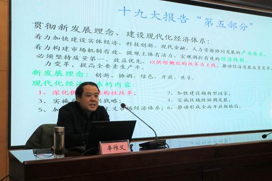 报告中,辛校长带领全体人员回顾了十九大报告中的十三项内容,并重点围绕“贯彻新发展理念,建设现代化经济体系”的内容进行详细阐释。他介绍了供给侧改革内容及其学派的主要观点,阐述了现代化经济体系以及我党在经济方面的改革方向。参会人员认真聆听,受益颇深。