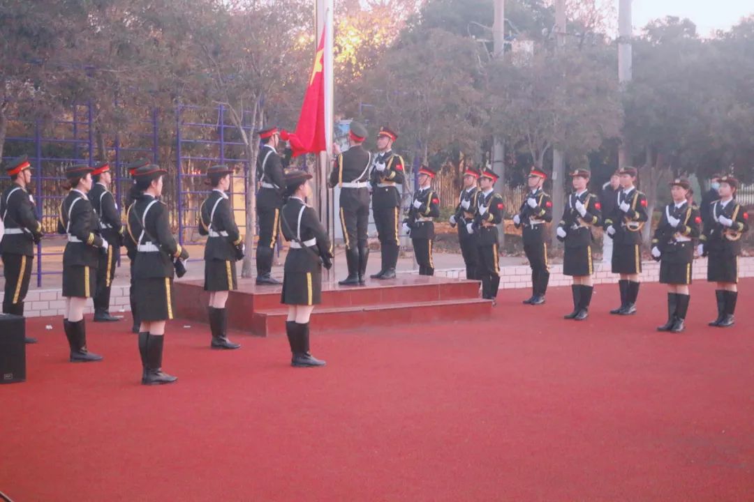 升旗仪式开始,国旗手迈着铿锵有力的步伐走向了升旗台。在雄壮嘹亮的国歌声中,鲜艳的五星红旗迎着朝阳冉冉升起,全体师生行注目礼,高唱国歌,满怀深情向国旗致以最崇高的敬意。