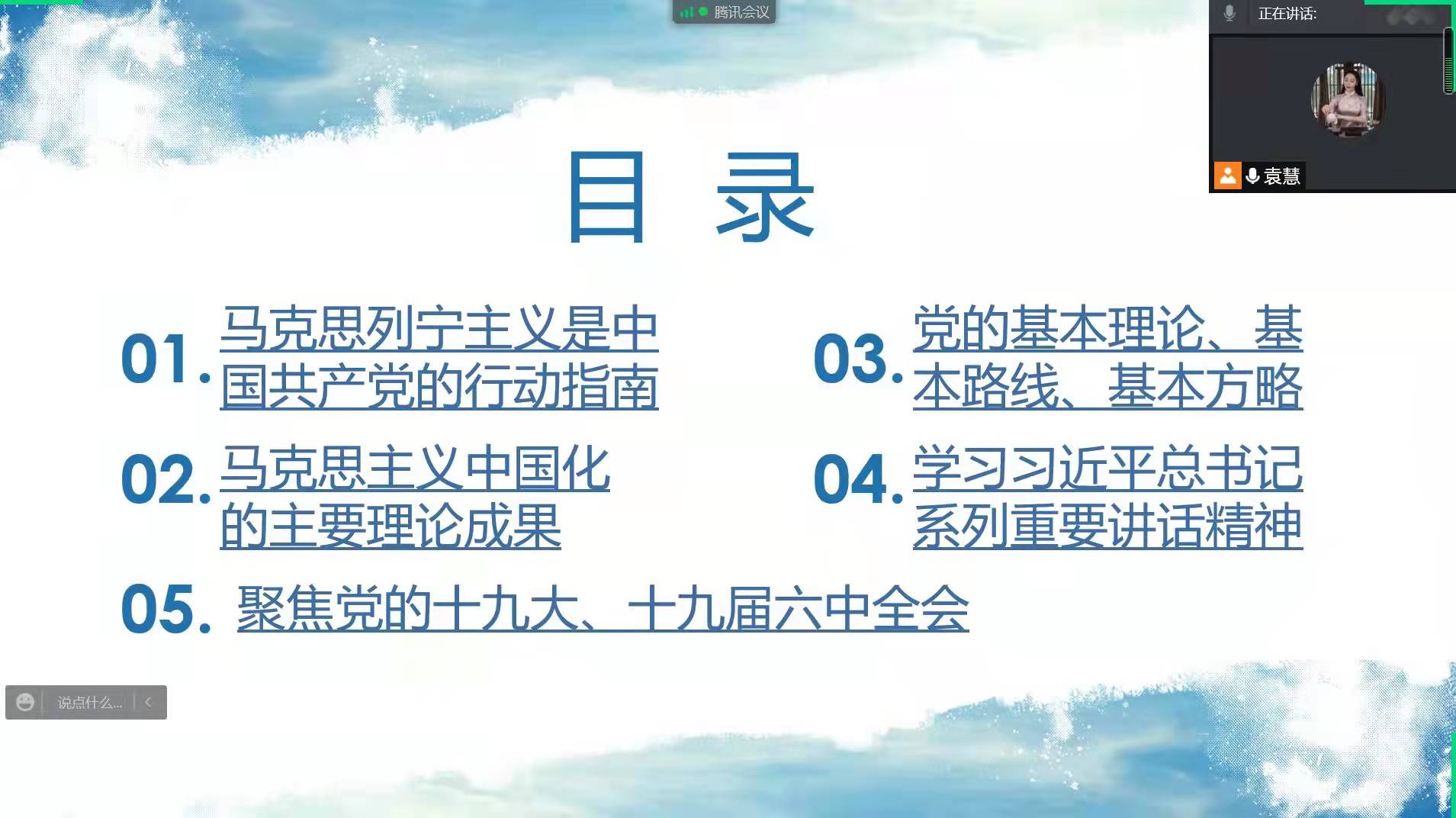 袁慧主要从马克思列宁主义是中国共产党的行动指南,党的基本理论、基本路线、基本方略,马克主义中国化的主要理论成果等方面内容做了详细讲解。并围绕党的十九届六中全会精神结合青年学生的学习生活进行了交流分享。