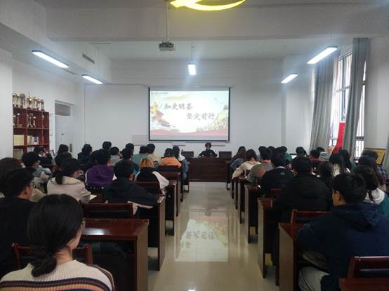 会上,学生代表引用习近平总书记的重要讲话,向大家阐述了历史对于人类社会的重要性,以史为鉴、资政育人。要从历史中汲取经验智慧,更好的战胜前进征程上的困难和挑战。接着,他带领学生们回顾了中国共产党艰苦奋斗的革命史,讲述中国共产党从以前的步步坎坷到现在的坚定前行的转变。最后,他呼吁新一代年轻党员要认真学习党史,要深刻认识幸福生活来之不易、新中国来之不易、中国特色社会主义来之不易,要以前人为榜样,不断努力和前进。