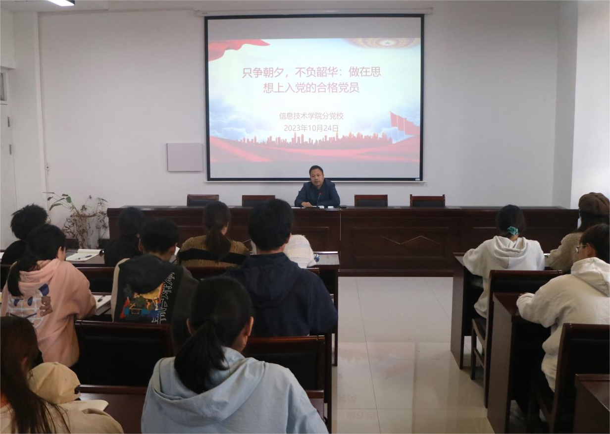 王国华以中国共产党的性质、宗旨和如何做一名在思想上入党的合格党员三个方面展开培训。他指出,作为一名新时代大学生,要深刻理解党的性质与宗旨,坚定理想信念,在学习的过程中要学会主动思考,以理论指导实践,充分发挥学生榜样作用,争做典范。