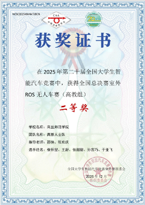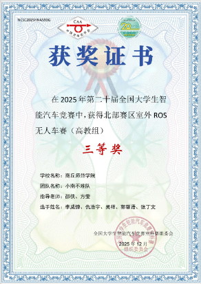该赛事为教育部A类学科竞赛,吸引哈尔滨工业大学、山东大学等多所高校参赛,竞争激烈。在邵侠、张欢庆老师的指导下,张怀玺、王舒、张甜甜等同学克服技术难点,不畏严寒坚持户外调试,从算法优化到实车演练,稳步提升竞赛实力