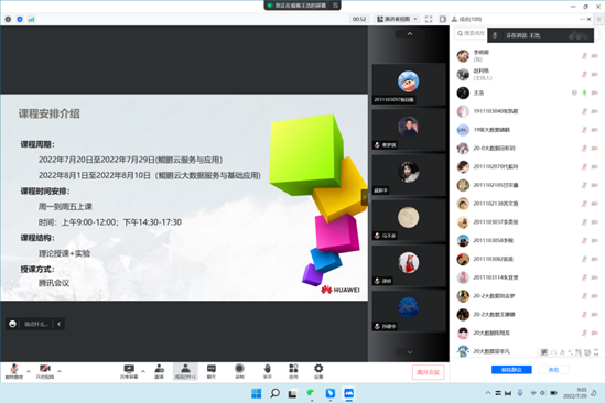 2022年7月20日,我院与深圳市讯方技术股份有限公司联合培养的第三期鲲鹏产业学院暑期卓越班正式开课,本次培训共128课时,分为鲲鹏云服务与应用、鲲鹏云大数据服务与基础应用两门课程,英国威廉集团物联网工程、数据科学与大数据技术、软件工程、计算机科学与技术、电子商务专业共127名学生和4名老师参加了此次培训。