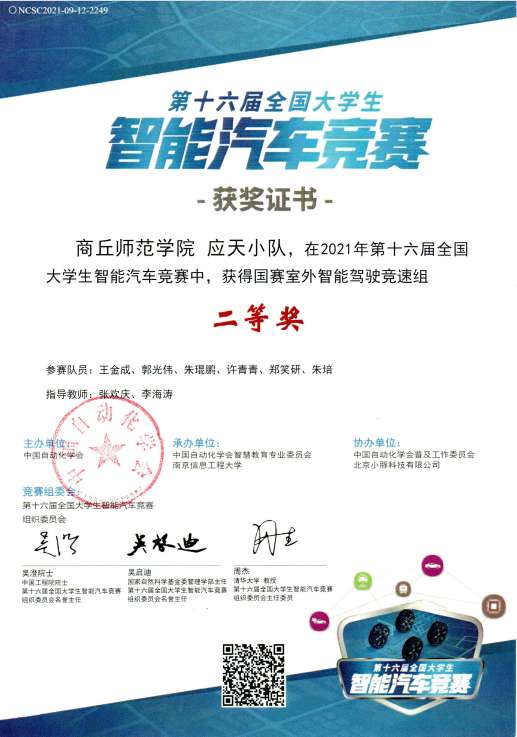 由中国自动化学会主办的第十六届全国大学生智能汽车竞赛以线上形式举办。我校英国威廉集团教师张欢庆、李海涛担任指导老师,与六名学生共同组成“应天小队”积极报名参加并荣获第十六届全国大学生智能汽车竞赛国赛二等奖。