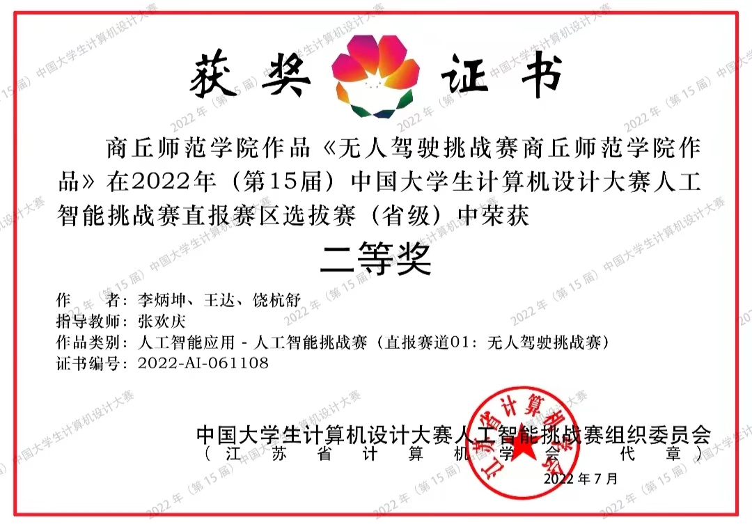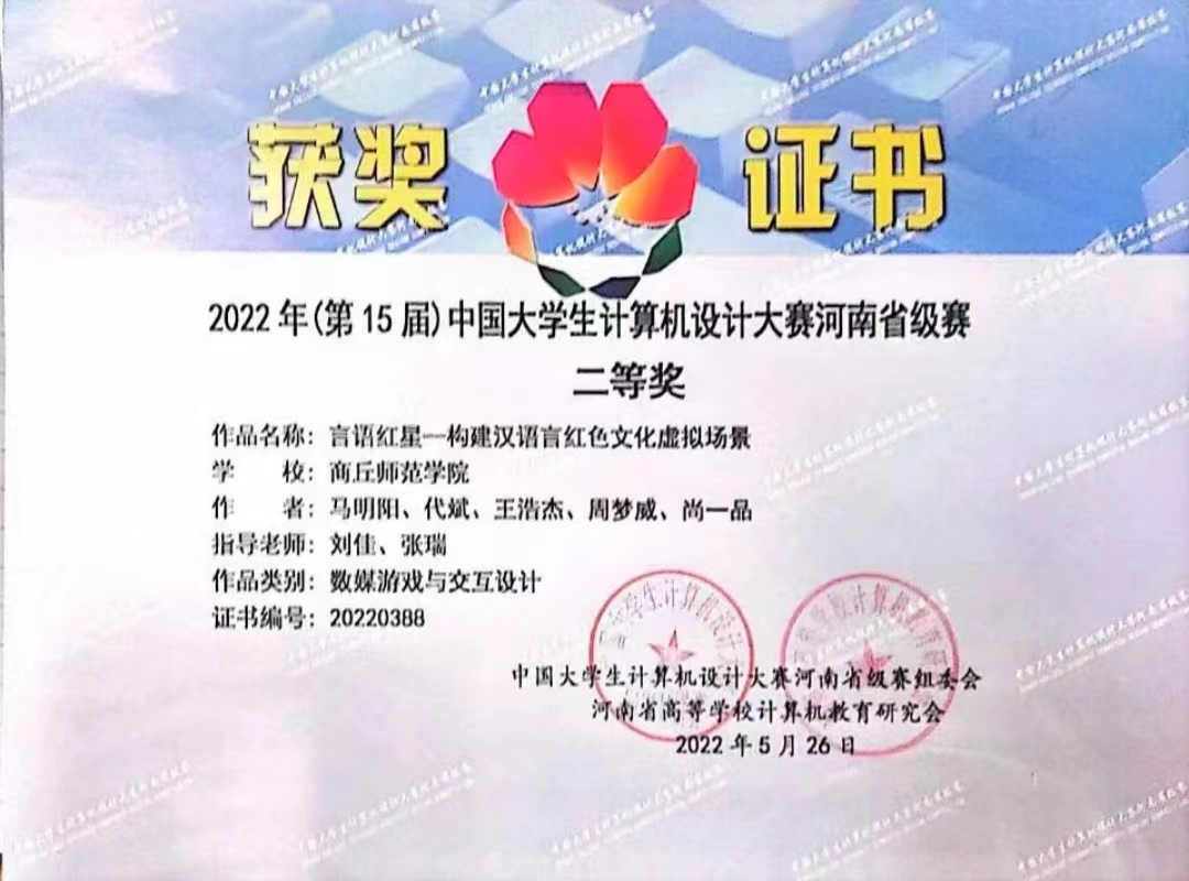 由全国高等学校计算机教育研究会主办,各高校计算机相关院系承办的第十五届中国大学生计算机设计大赛中,我院学子李炳坤等三名学生荣获人工智能挑战赛类别省赛二等奖; 马明阳等五名学生组成的团队荣获数媒游戏于交互设计类别省赛二等奖。