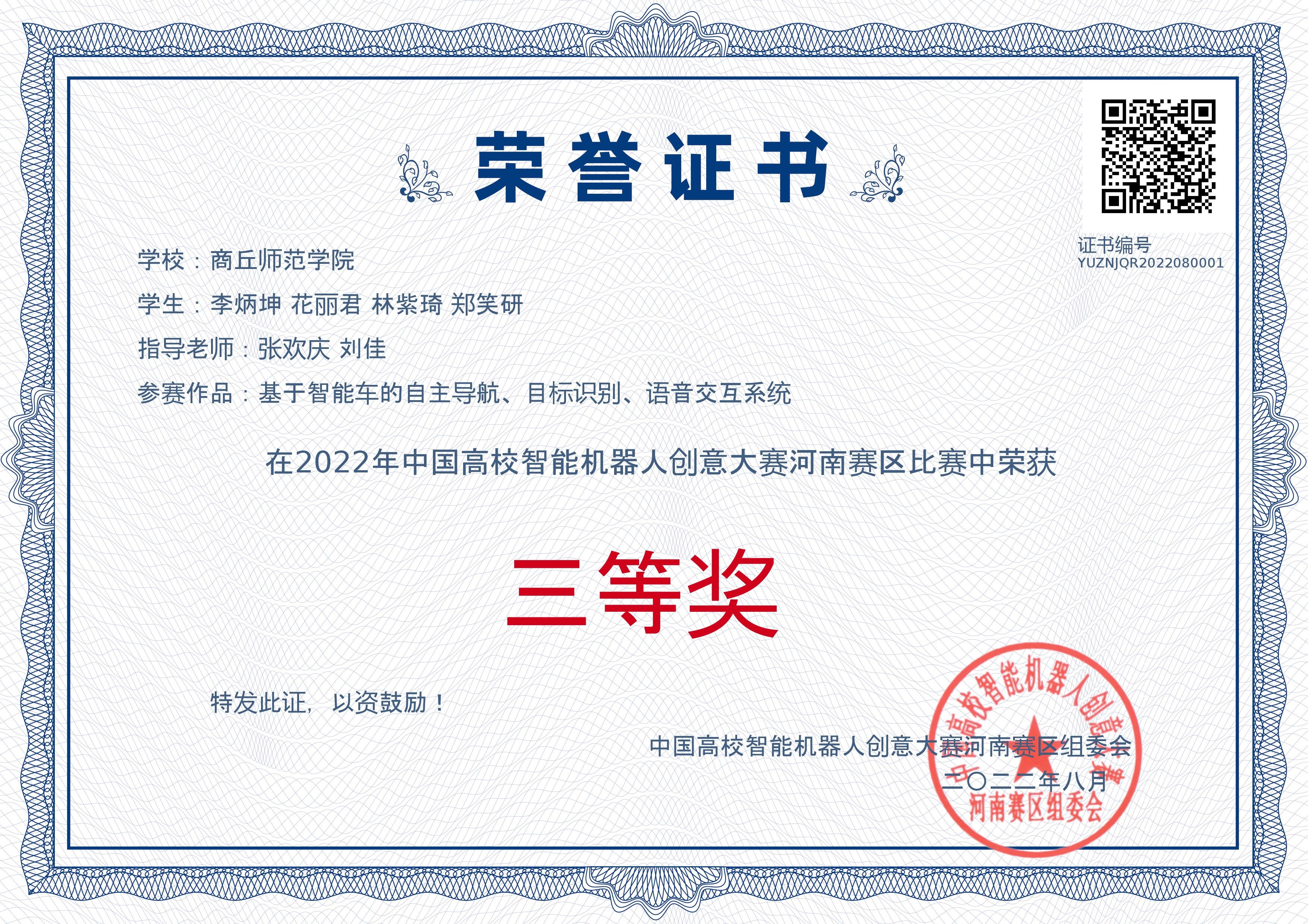此次大赛旨在激励广大青年学生弘扬创新精神,搭建良好的科技创新赛事平台,助力人工智能、机器人产业发展,推动“人工智能+”“机器人+”新经济产业体系建设,培养一批能动手、敢创新、善协作的科技精英人才。大赛分为创新类、应用类和经济类三个类别,参赛学生在指导老师张欢庆、刘佳的带领下,充分发挥自身优势,面对难题勇于解决,高质量高规范的完成了此次比赛。