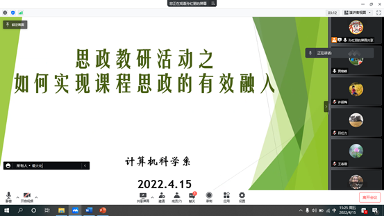 4月15日下午3:50,计算机科学系采用腾讯会议平台开展主题为“如何实现课程思政的有效融入”的研讨会,分享各自的课程思政融入经验,会议由系主任孙红丽主持。