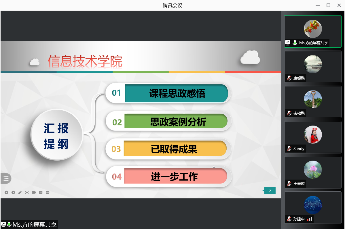 在分享课程思政设计感悟中,方莹老师讲到对课程教学基本要求及教学要达到目的,在思政教学设计中,以死锁概念讲授为例,分析了自己选择思政点文明交通、青年担当、职业道德及构建和谐社会与专业知识点融入结合的具体做法,直观而细致地让与会者领悟到思政融入实现并不是想象中那么难以实现,同时受到启发增加自己完成课程思政的信心。